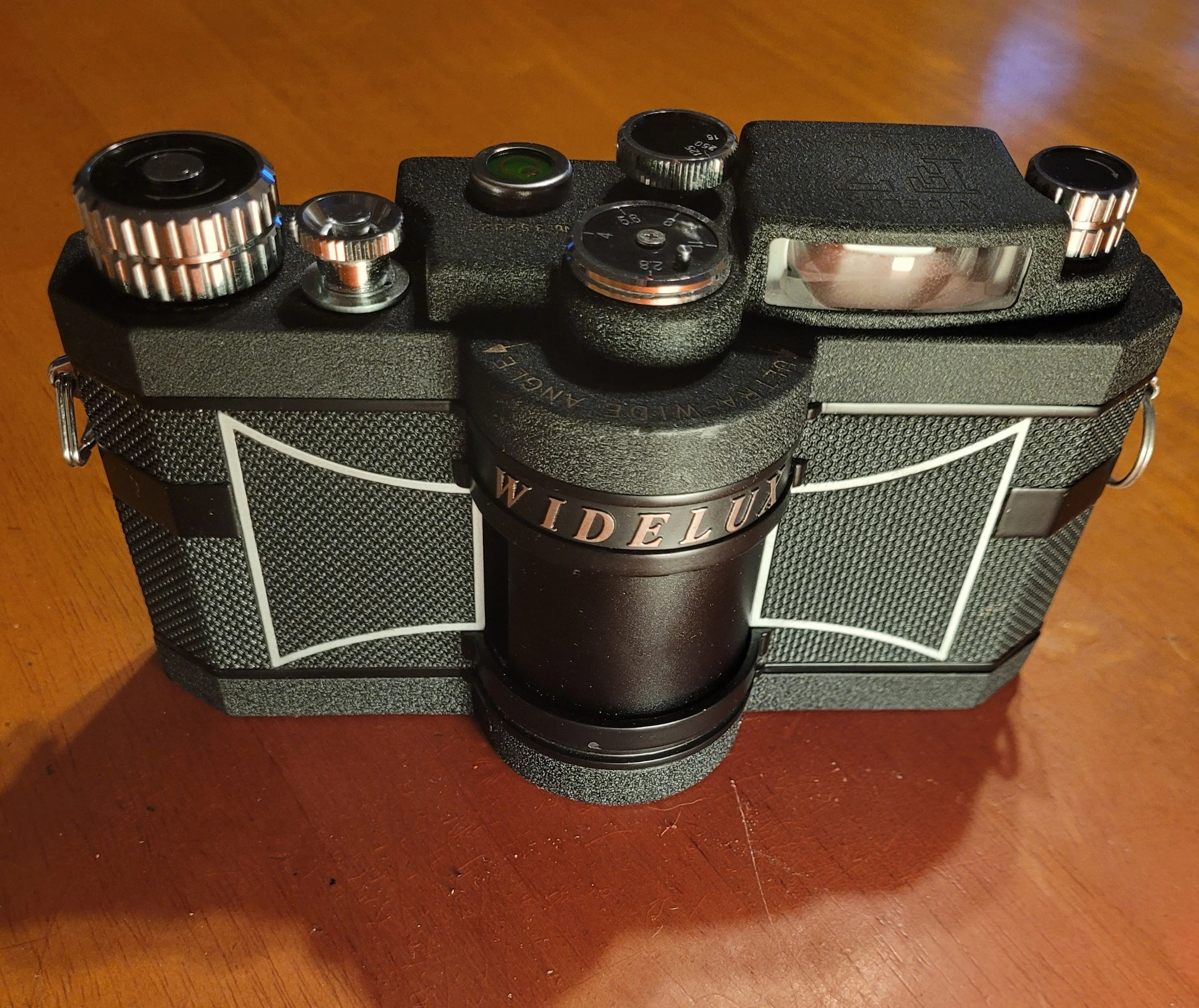 A peculiar looking piece of mechanical ingenuity. Where there would normally be a barrel of a lens, it appears as though someone has fused a tower into the center of a camera body.